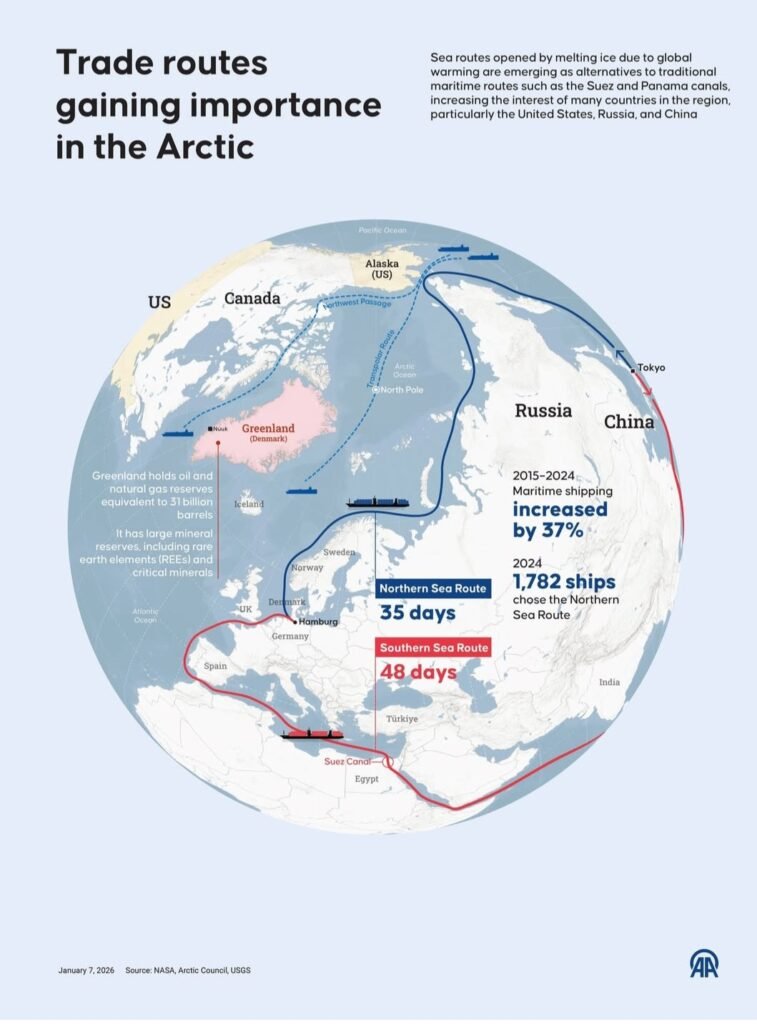تشير الصورة إلى أن الأهمية ليست تجارية فقط بل استراتيجية ومعدنية، حيث تذكر عن غرينلاند:
