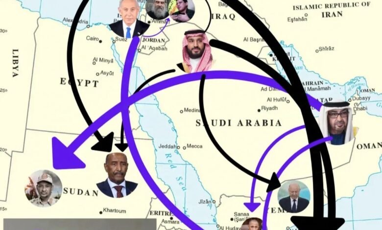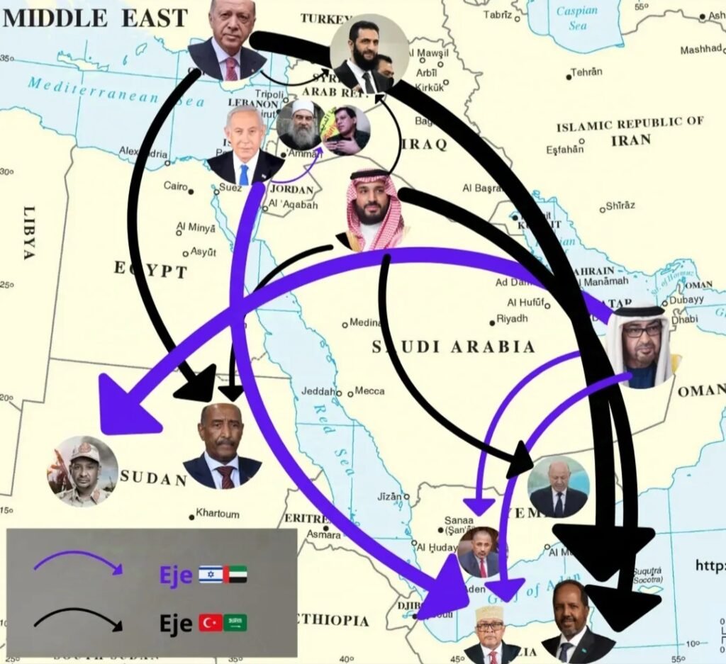 تُظهر الأسهم المتداخلة أن المنطقة تعيش حالة من السيولة السياسية، حيث التحالفات قد تتغير بناءً على المصالح الآنية. لكن الثابت الوحيد هو أن الصراع على “المحاور” (Ejes) هو المحرك الأساسي للأحداث، سواء في غزة، أو الخرطوم، أو مقديشو. الخريطة باختصار هي تجسيد لسياسة “ملء الفراغ” في منطقة لا تهدأ فيها رياح التغيير.
